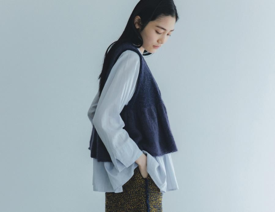 2025.10.28 シルクモヘヤとウールアルパカのジレ キット スッキリした上部から広がるフリルのシルエットが魅力的なウエア。
