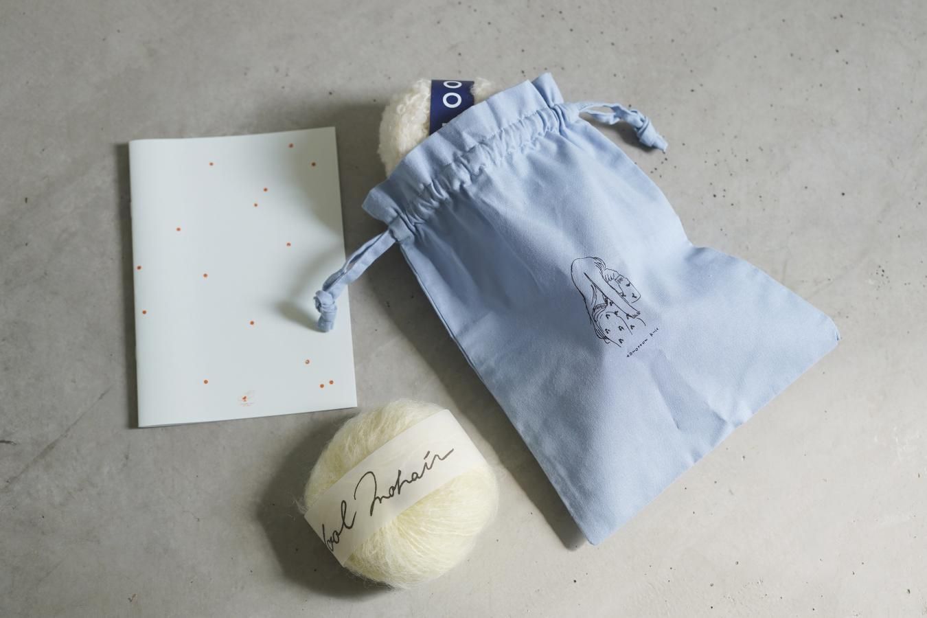 毛糸やキットをお買い上げの方には、キュートな巾着と、前回のフェアでご好評だったノートブックのノベルティとしてご用意しています。バッグの中を整理するポーチとして、編みかけの毛糸をいれるプロジェクトバッグにしても素敵ですね。